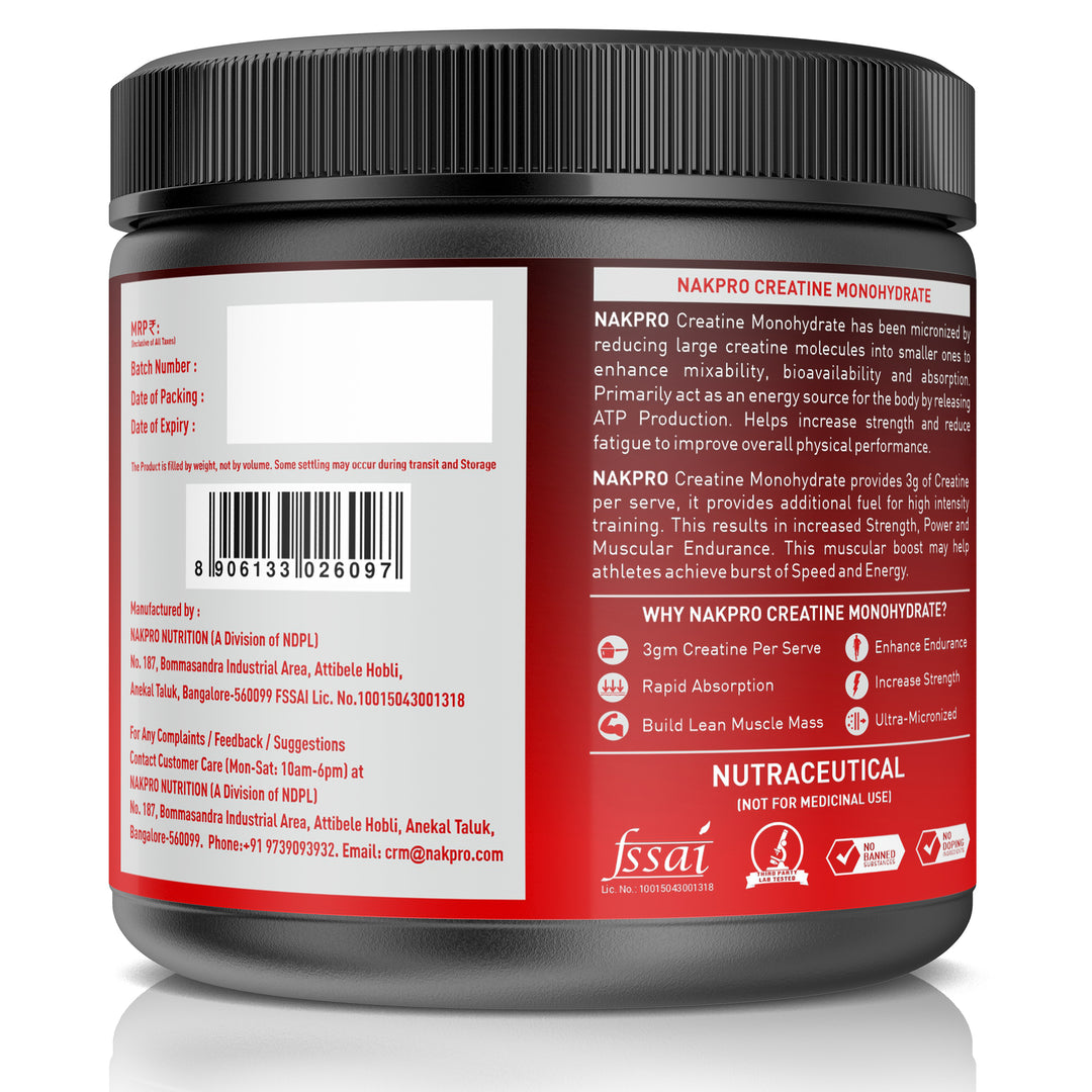 Nakpro’s Creatine Monohydrate is micronized for better solubility and absorption, ensuring you get the most out of every scoop.