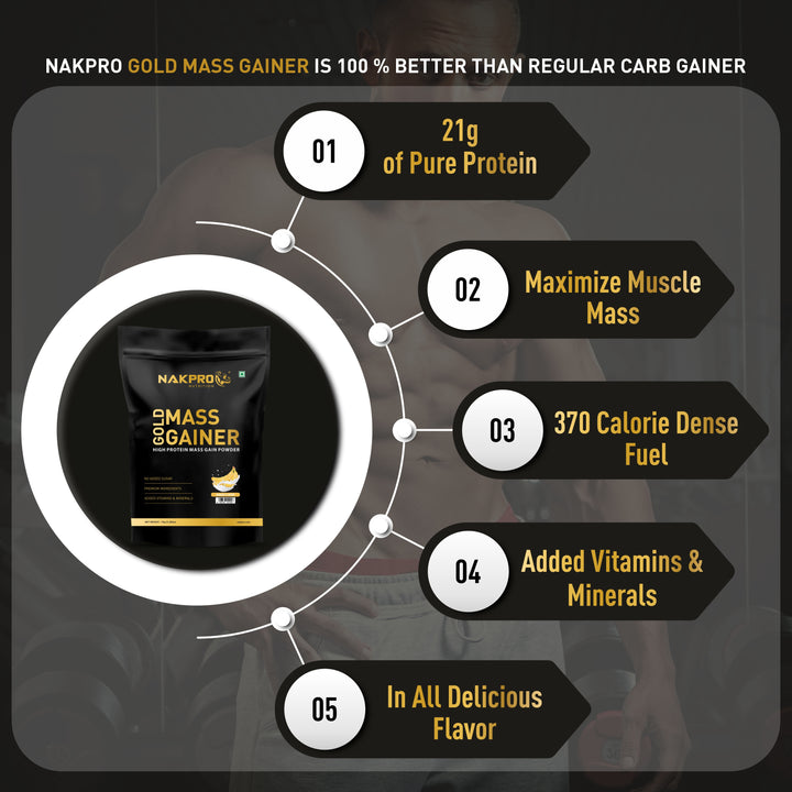 - HIGH-CALORIE: Nakpro Gold Mass Gainer is specially formulated for fitness enthusiasts who strive to gain muscle mass & physique. It has high-calorie formula that helps you meet your daily calories requirements.