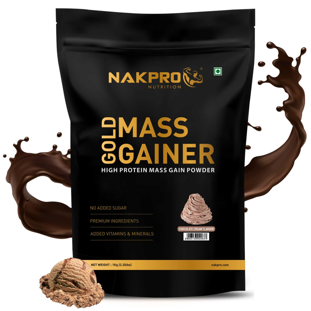 - LEAN MUSCLE MASS GAIN WITH NO SIDE EFFECTS: Nakpro gold mass gainer protein powder is loaded with High Calories, Healthy Fat, BCAAs that help build lean muscles and improve your exercise performance. It is enriched with 27 vitamins and minerals that help in boosting immunity and provide performance fuel to conquer your workout. It contains no added sugar and is trans-fat-free.