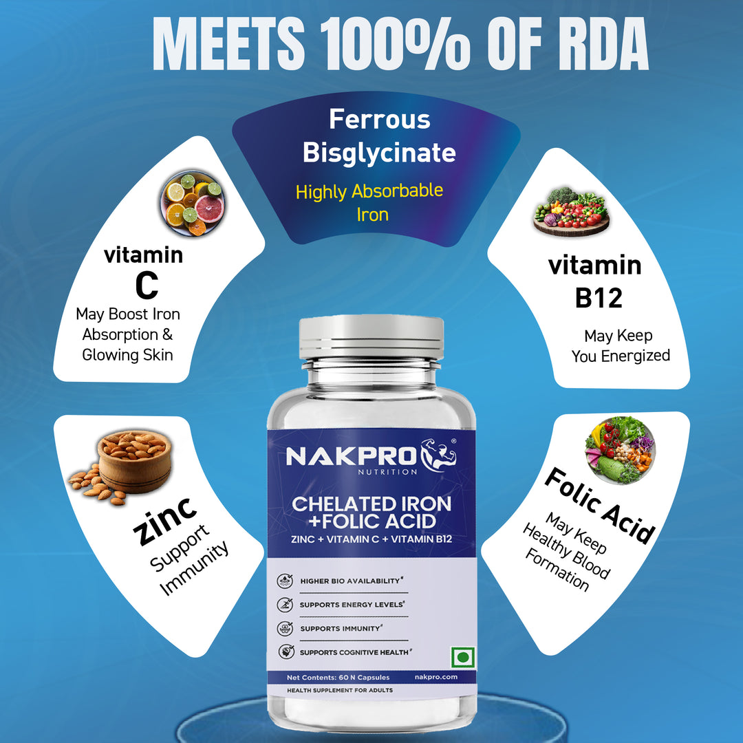 Enhanced with ingredients which meets 100% RDA: As Nakpro’s Chelated Iron capsule is with all essential vitamins which meets 100% RDA per single tablet intake.