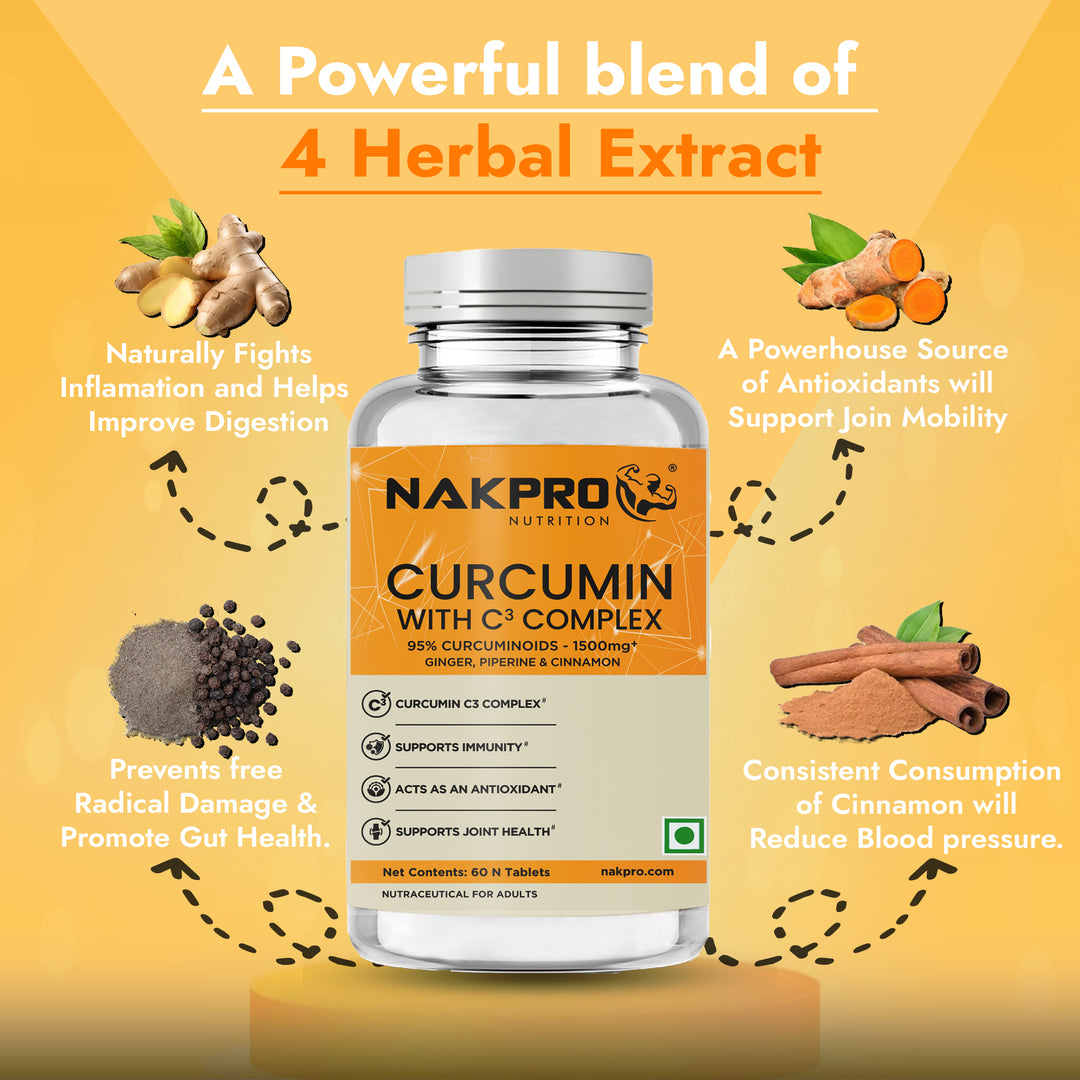 Nakpro’s Curcumin tablets are specially crafted with 1500 mg of Curcuminoids complex along with zingiber officinale, piper nigrum officinale & cinnamon verum extract. These nutrients play a crucial role in supporting overall health and the combination helps fill any many potential gaps in your diet.