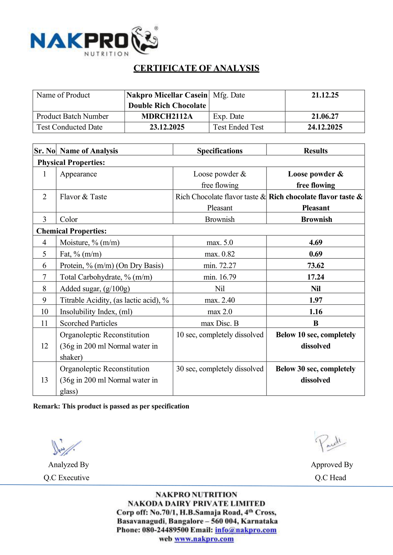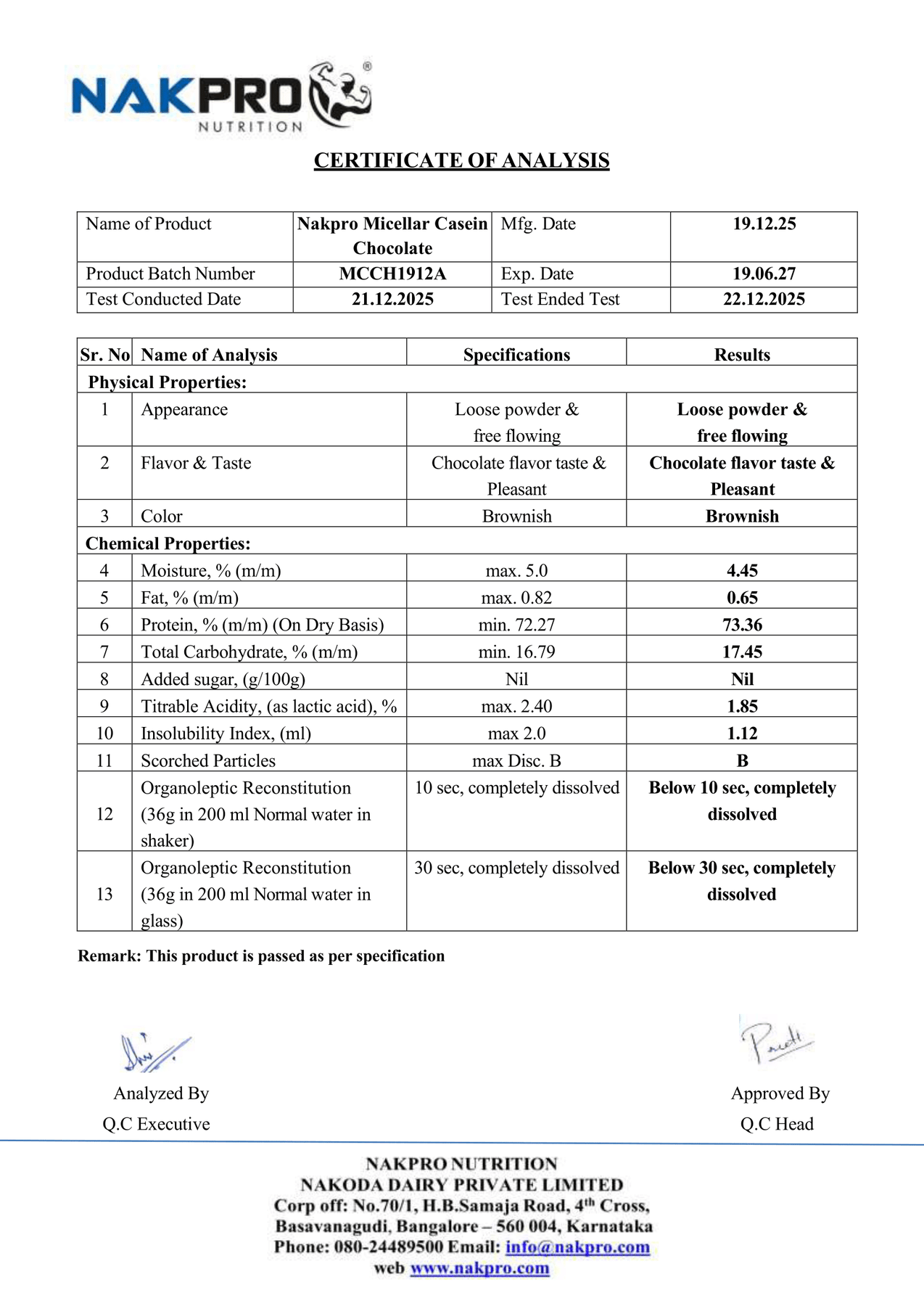 NAKPRO MICELLAR CASEIN LAB TEST REPORT